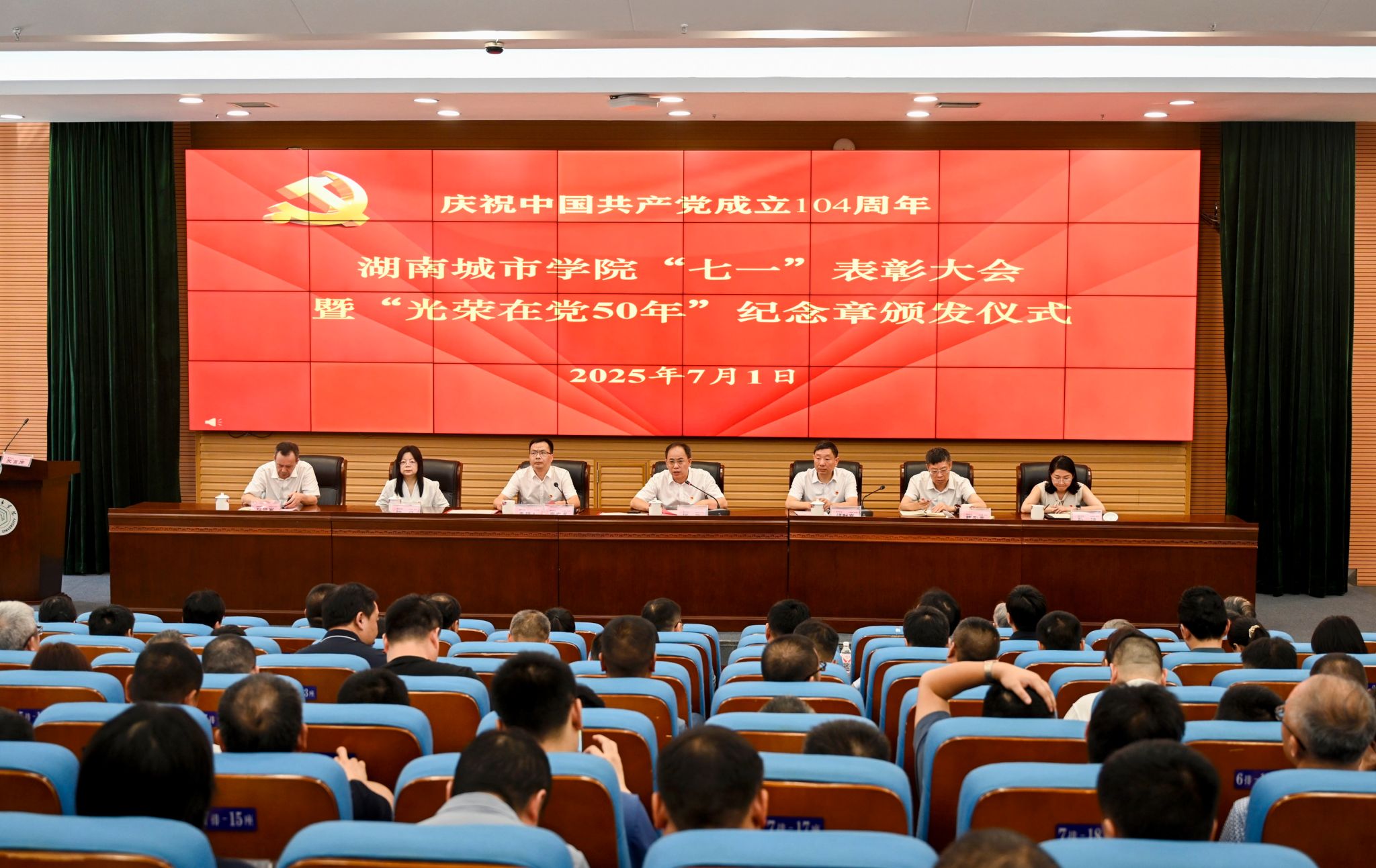 本网讯(通讯员 陈艳姣)为庆祝中国共产党成立104周年,表彰先进典型,凝聚奋进力量,7月1日上午,学校举行2025年“七一”表彰大会暨“光荣在党50年”纪念章颁发仪式,在家的校领导出席大会。会议由党委副书记袁志成主持。