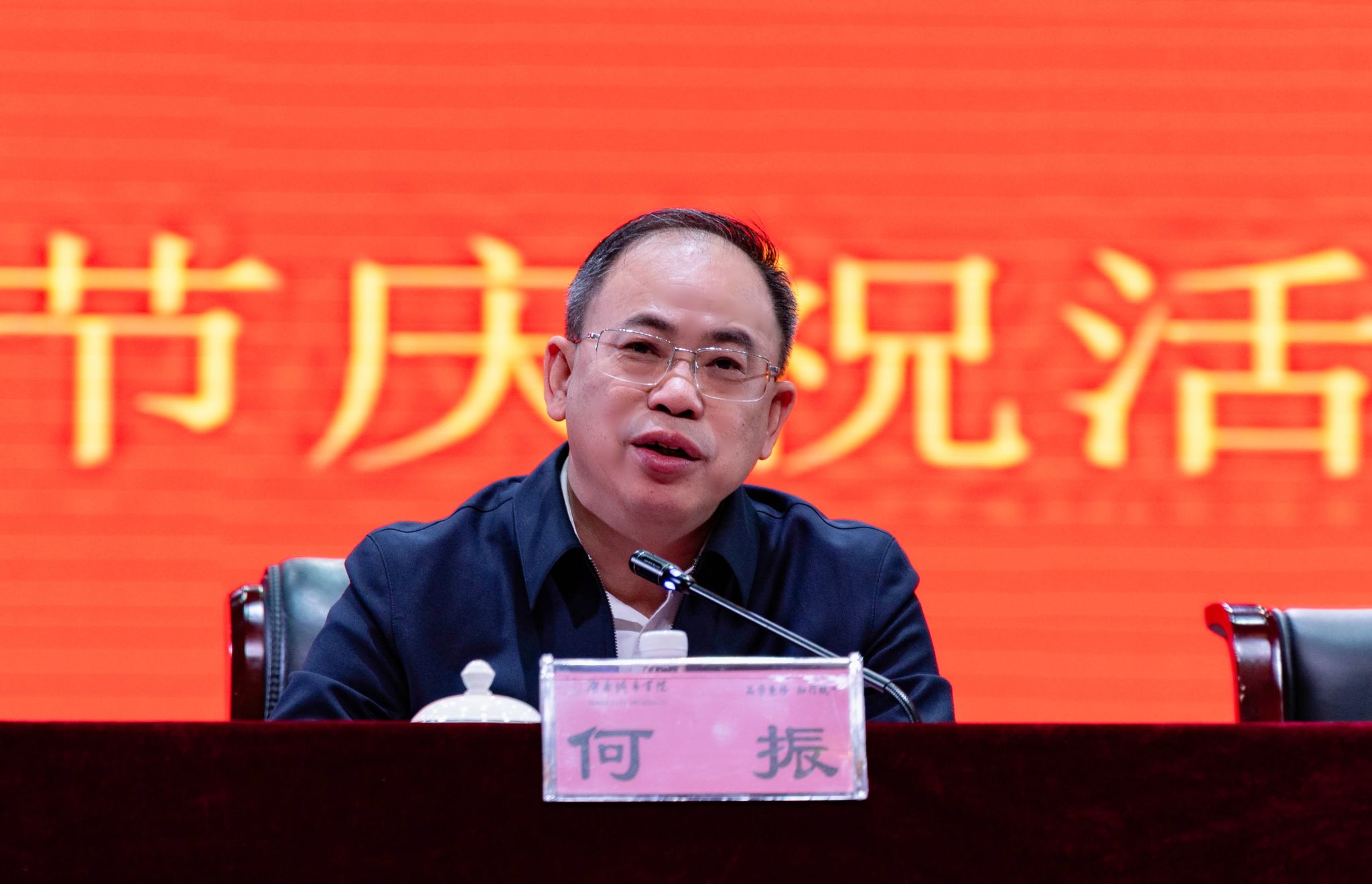 活动在庄严的国歌声中拉开序幕。何振代表学校党委行政向各位老同志致以节日的问候和祝福,向受表彰的先进个人,八十大寿、九十大寿的寿星,金婚、钻石婚夫妇致以崇高的敬意。何振简要介绍了今年学校在教育教学、科学研究、人才培养、社会服务和离退休工作等方面取得的优异成绩,对老同志们为学校建设发展贡献的智慧力量、倾注的辛勤汗水表示衷心的感谢。