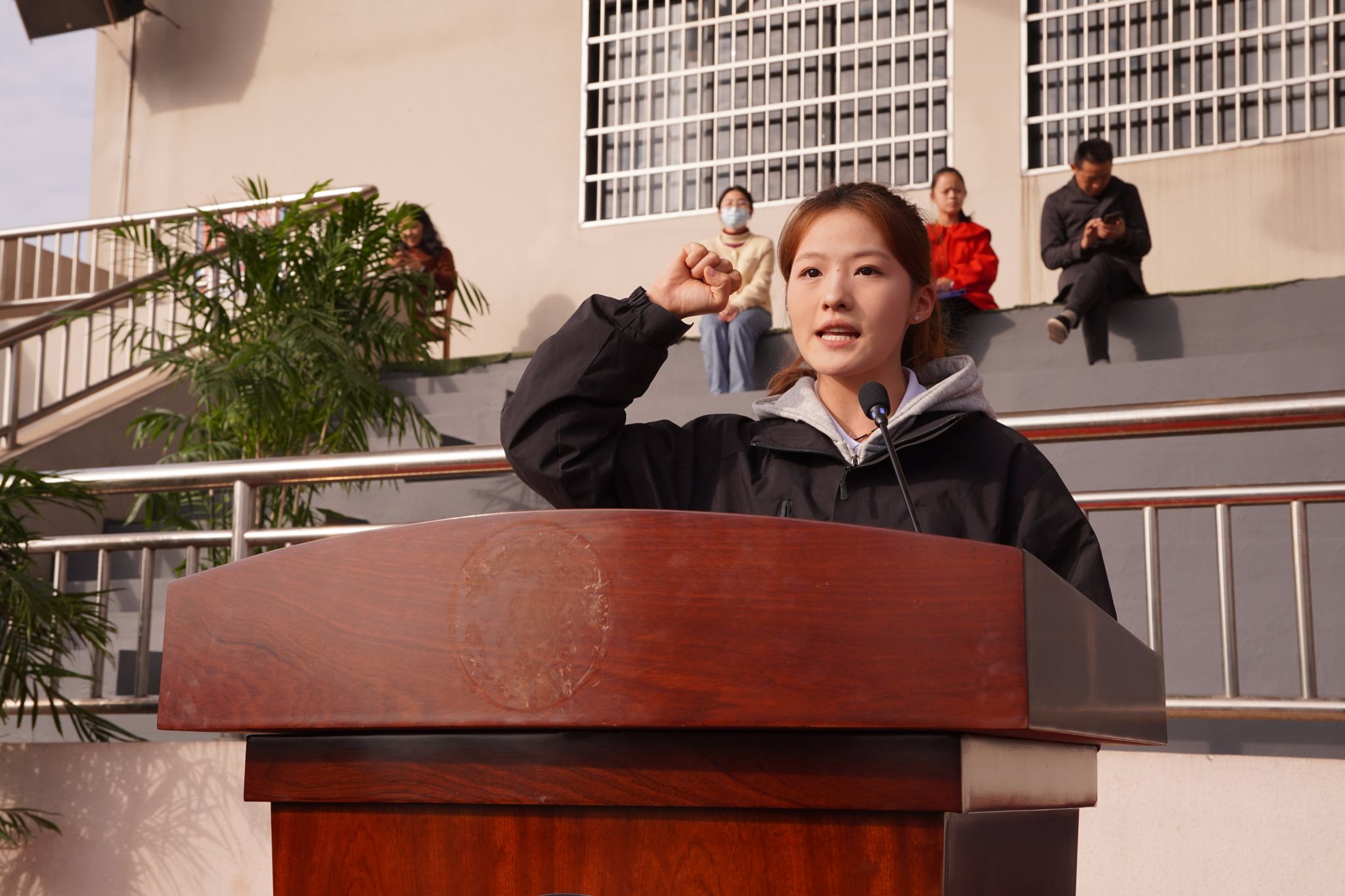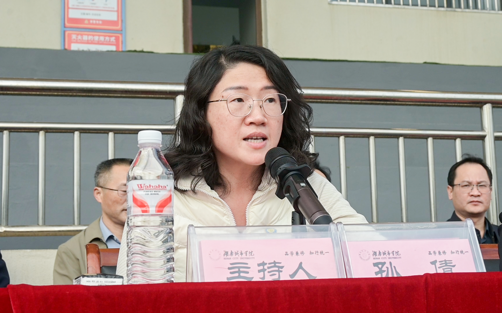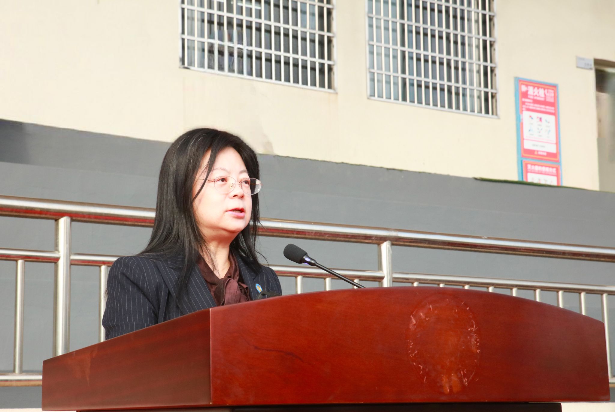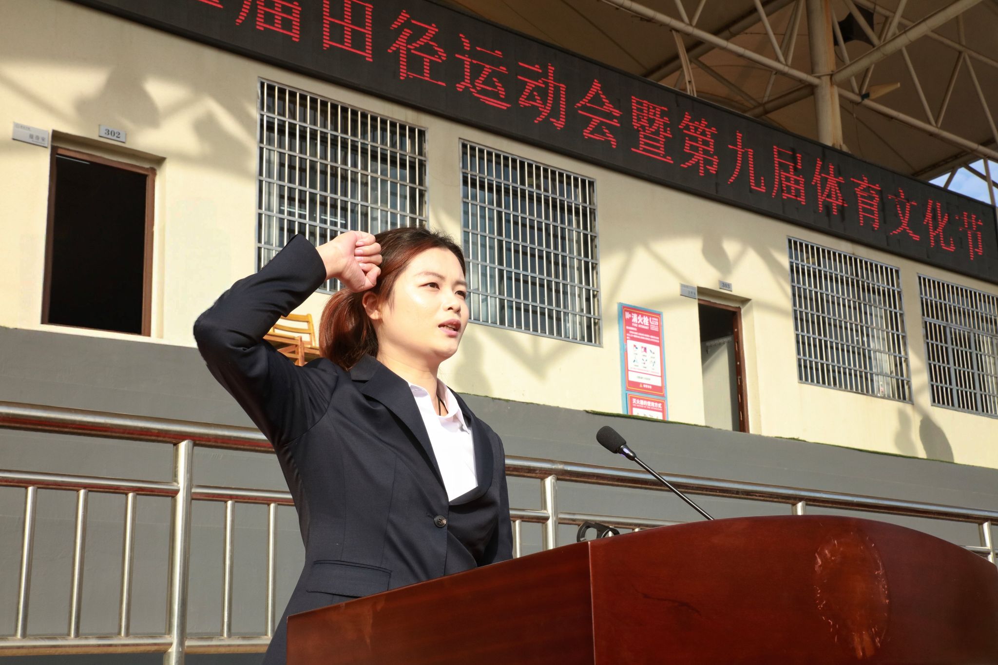 副校长徐姝发表了热情洋溢的致辞。她表示,我校大力推进体育课程改革,广泛开展学生课外体育活动,营造了良好的校园体育文化氛围,并在体育竞赛方面取得了不错成绩。希望参加本次运动会的运动员们公平竞争,团结互助,朝着更快、更高、更强的目标挑战自己、超越自己,用坚韧书写青春华章;全体裁判员要恪尽职守,公平裁判,用规则守护公平正义,全力奉献一场精彩纷呈的文化体育盛会。