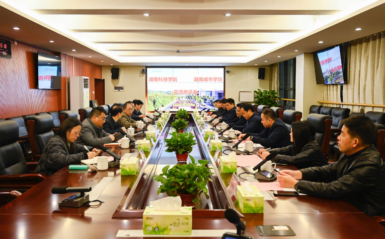 本网讯 11月17日下午,湖南科技学院党委书记李钢,党委副书记、校长黄创霞一行来我校交流考察,座谈会在办公楼一会议室举行,校党委书记何振、党委副书记袁志成、副校长孙倩出席会议。
