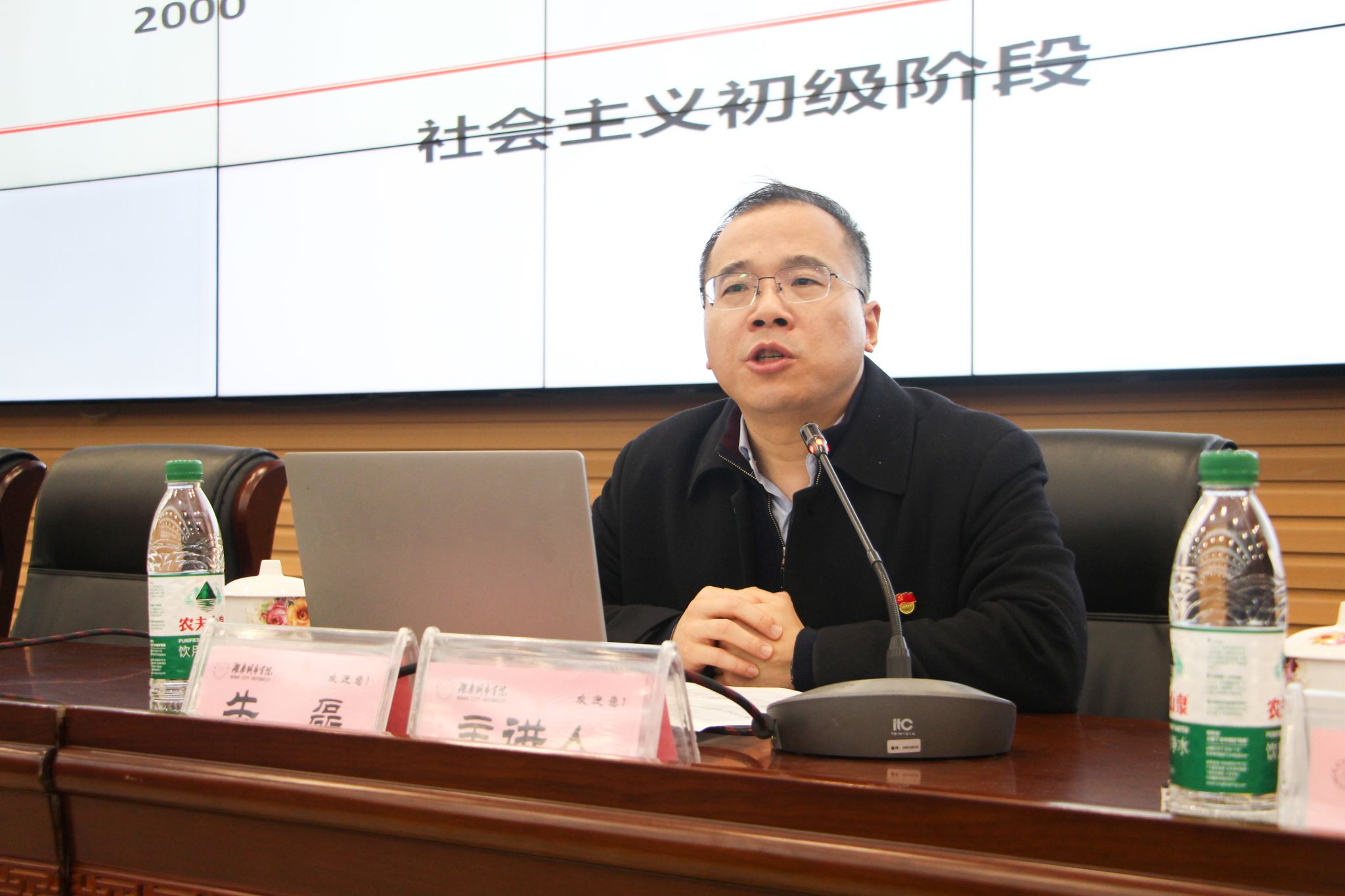 会上,牛磊以《科学谋划,精准发力,为2035年基本实现现代化奠定扎实基础》为题,对党的二十届四中全会精神进行了系统宣讲。他围绕全会审议通过的《中共中央关于制定国民经济和社会发展第十五个五年规划的建议》,全面解读了“十五五”时期的战略方位与发展脉络,深刻分析了党和国家事业取得的重大成就和发展环境面临的复杂变化,深入阐释了“十五五”时期的指导思想、主要目标、战略任务和重大举措。报告紧扣湖南省贯彻落实全会精神的具体部署,内容详实、条理清晰,为全校师生干部准确把握全会精神实质、系统擘画学校高质量发展新路径提供了科学指导。