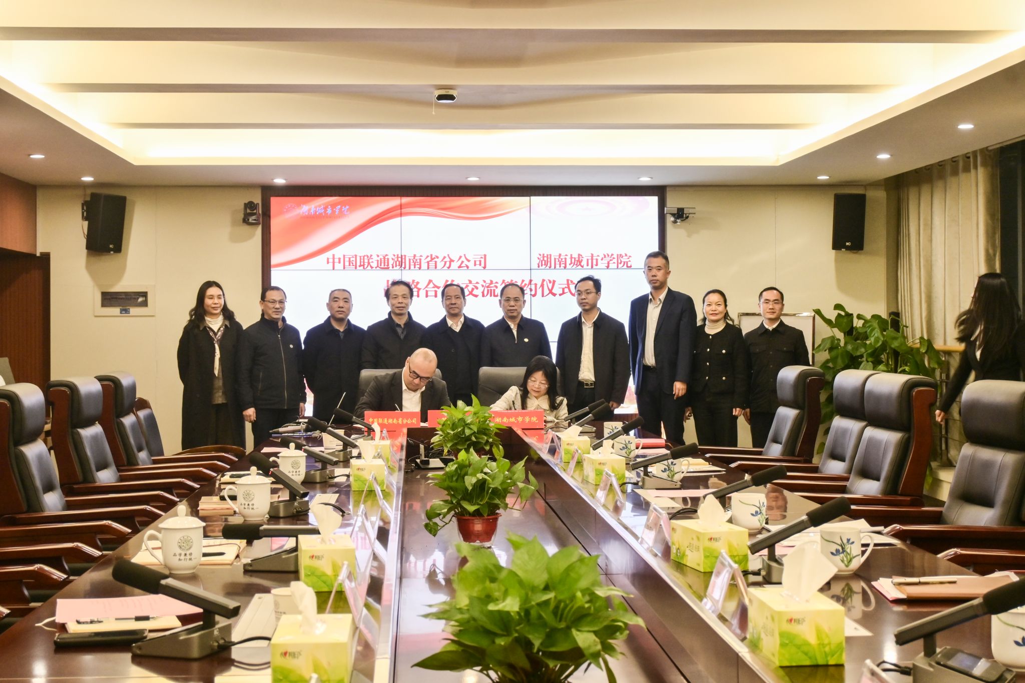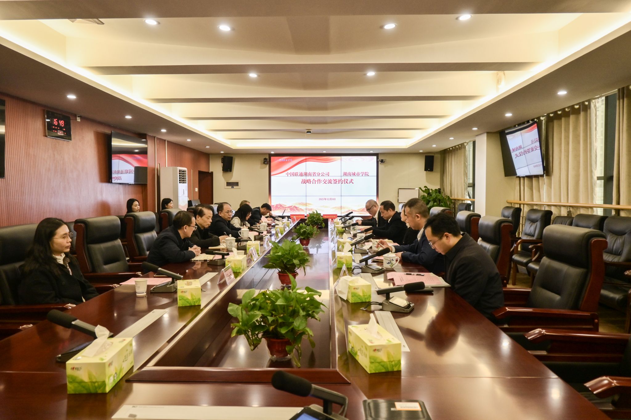 本网讯(智慧校园建设与管理中心供稿)为积极响应国家教育数字化战略,深化产教融合,推动高等教育数字化转型与高质量发展,12月9日下午,我校与中国联合网络通信有限公司湖南省分公司(以下简称“湖南联通”)战略合作框架协议签约仪式在学校办公楼一会议室举行。学校党委书记何振、副校长徐姝,湖南联通党委书记、总经理周智,益阳联通总经理袁泉出席仪式。签约仪式由徐姝主持。