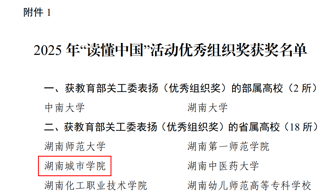 本网讯(通讯员 罗延富)近日,中共湖南省委教育工委下发《关于公布2025年全省普通高校“读懂中国”主题教育活动优秀组织奖和作品奖评审结果的通知》。我校荣获2025年国家教育部关工委“读懂中国”主题教育活动优秀组织奖,并获最佳微视频1个;获省教育厅关工委特等奖1项、二等奖4项、三等奖1项。