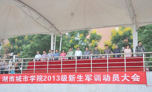 ,2013级新生军训动员大会在校本部田径场隆重举行。副校长丁亮中、益阳市武警支队参谋长夏兴伟,相关处室、二级学院负责人以及2013级新生和全体承训官兵参加了军训动员大会。大会由武装部部长贺正宜主持。