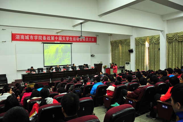 下午,响亮的口号声在学校视频会议室响起,我校备战2014年湖南省第十届大学生运动会的125名运动员和教练员在集训动员大会上庄严宣誓。党委副书记、副校长孟昭武,党政办、教务处、宣传部、学生处、团委相关负责人以及体育学院党政领导出席了动员大会。
