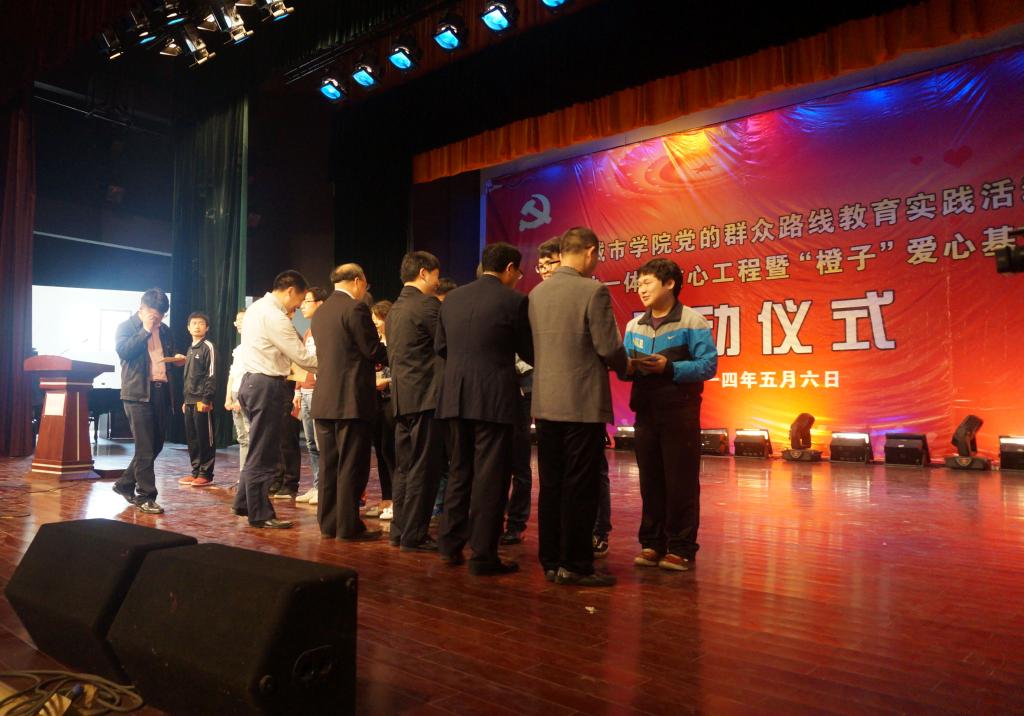 (本网讯)“付出的是爱心和真情,收获的是快乐和欣慰”。5月6日下午,大发官方版网站登录入口党的群众路线教育实践活动“三位一体贴心工程”暨“橙子”爱心基金启动仪式在我校音乐厅举行,学校党的群众路线教育实践活动领导小组全体成员,机关处室主要负责人,各二级学院院长、党总支书记及分管学生工作的副书记,学生代表,益阳移动和益阳联通公司负责人参加。仪式由学校党委副书记、校长李建华主持。