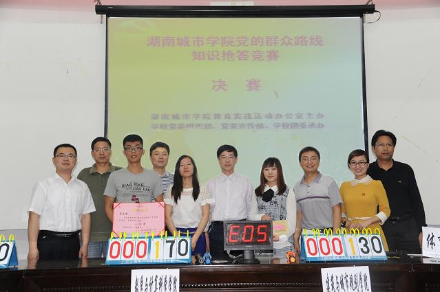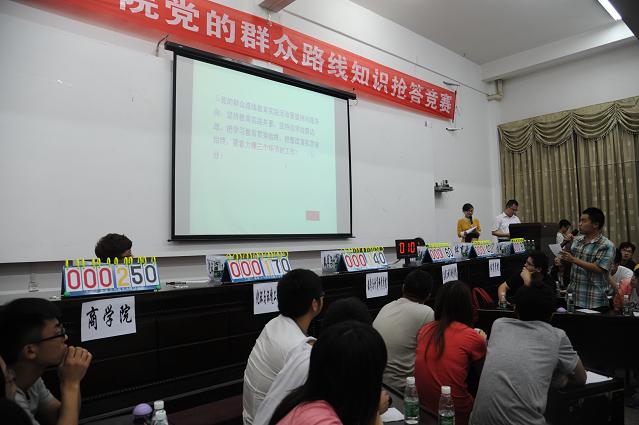 比赛内容紧扣党的“十八大”报告、十八届三中全会精神、中共中央关于开展群众路线教育实践活动实施意见、习近平总书记重要讲话精神和党章等相关知识;特别是还紧密结合了学校党的群众路线教育实践活动的方案和举措等。比赛包括3个环节:旗开得胜(必答题)、抢占先机(抢答题)和赶超进位(风险题)等。在决赛的现场,参赛队伍热情高涨,配合密切,抢答积极,正答率高,难分伯仲,将比赛一次次推向高潮。最终,商学院代表队战胜群雄,勇夺冠军;信息科学与工程学院和数学与计算科学学院代表队荣获二等奖;体育学院、建筑与城市规划学院、化学与环境工程学院代表队获得三等奖。其他相关学院获得了比赛的优胜奖。