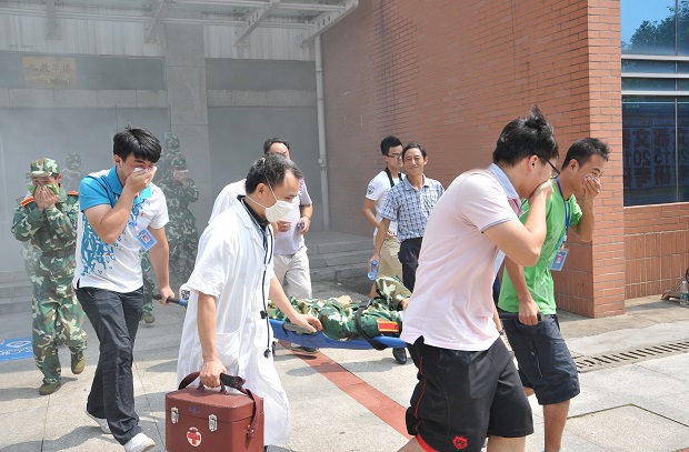 被困学生在义务消防员的指挥下用湿毛巾捂住口鼻低姿势快速撤离起火建筑物,并有秩序地向煤渣操场疏散。同时搜救队分层对被困人员进行了搜救,10分钟后,疏散人员安全到达指定地点,各军训营教官向总指挥报告疏散人数,所有人员被安全撤离。