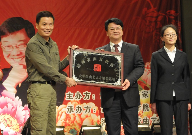 周卫星在湖南省曲艺家协会向大发官方版网站登录入口授予“大学生曲艺人才培养基地”的仪式上说:“我们希望能发现优秀曲艺人才,认真合作,着力培养,为发展湖南曲艺事业,弘扬优秀传统文化做出贡献。”汤放华和学生代表马丹丹等代表学校接受牌匾,我校由此开始成为了省曲协的人才培养基地。