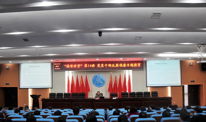 (本网讯) 1 16 下午,“德智讲堂”第十四讲在图书馆报告厅举行。湖南省监察学会副会长、商学院副校长王明高应邀作了“党员、干部反腐倡廉专题”报告。在家的校领导、全校副科级以上干部,党总支、直属支部委员,教工党支部书记,学生党支部书记,马克思主义学院教师等200余人参加了报告会。党委书记李建华主持报告会并对学校教育实践活动整改落实“回头看”工作作了部署。