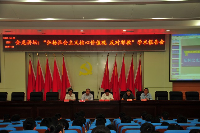 日下午,“弘扬社会主义核心价值观反对邪教论坛”在图书馆报告厅隆重举行。党委副书记、副校长龚卫明,省610办副厅级纪检员陆波,省反邪教协会秘书长胡跃龙,副秘书长钟晓光,益阳市政法委副书记、市610办主任郭陆武出席论坛。湖南省反对邪教巡回报告团专家、我校马克思主义学院教授涂建华向400余名师生深刻剖析了邪教的本质。