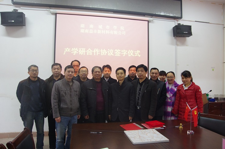 (本网讯)3月17日下午,我校与湖南益丰新材料有限公司产学研合作协议签字仪式在化学与环境工程学院会议室举行。湖南益丰新材料有限公司董事长杨智、总经理杨建良、安全经理龚小明、生产部长姜志明等应邀出席签字仪式。副校长刘辉煌、化学与环境工程学院部分班子成员及高分子材料教研室全体教师参加了仪式。