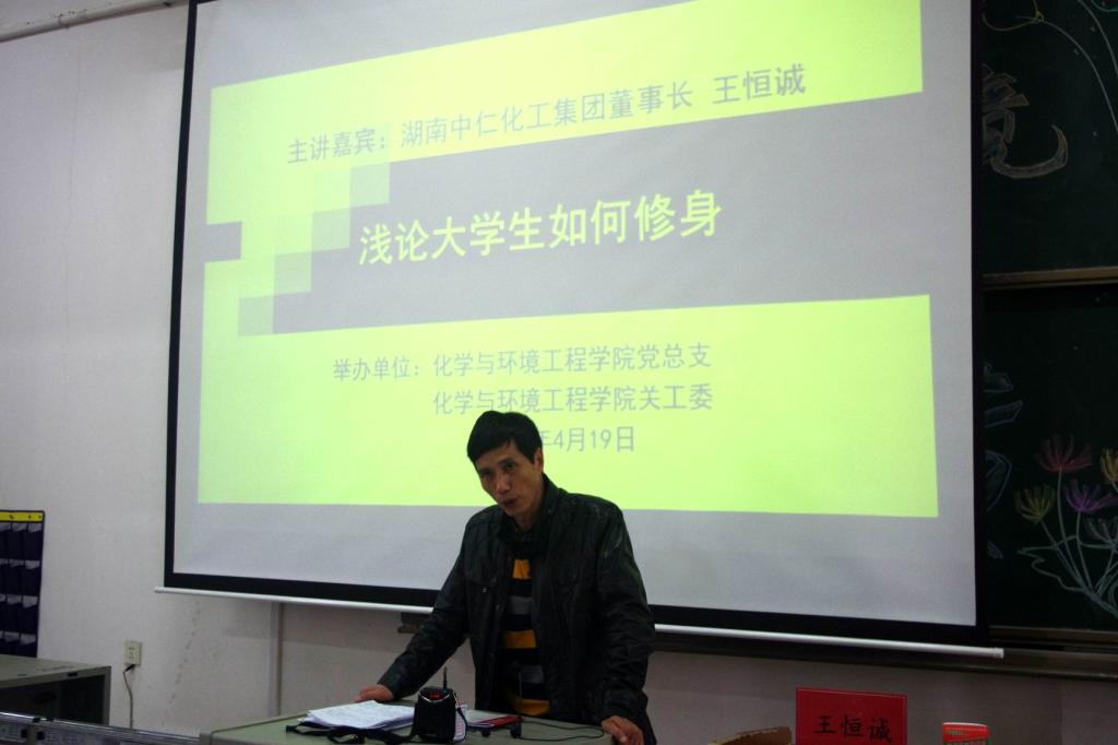 (本网讯)4月19日下午,湖南中仁化工集团董事长王恒诚应邀为化学与环境工程学院师生作了题为“浅论大学生如何修身”的德育讲座。化环院相关负责人以及150余名学生代表现场聆听了讲座。