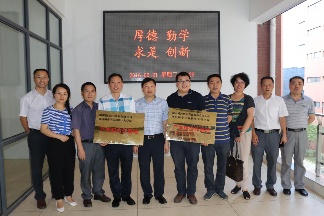 (本网讯)6月22日下午,机电工程学院第二批产学研合作基地协议签订暨授牌仪式举行。副校长谭献良出席仪式并讲话,湖南桃花江实业有限公司、湖南风河竹业科技股份有限公司、湖南天翔股份有限公司等三家企业负责人参加了授牌仪式。
