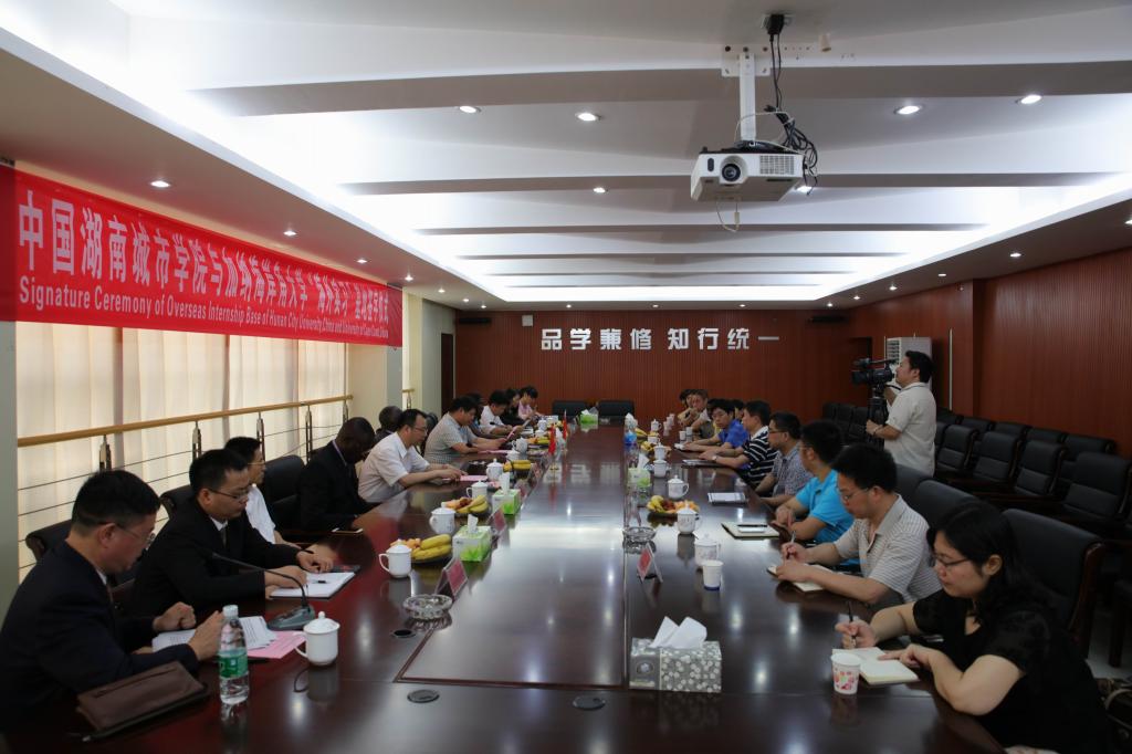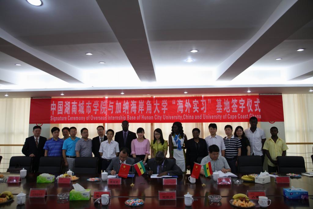 (本网讯)6月22日上午,我校与加纳海岸角大学在办公楼一会议室签署海外实习基地协议。海岸角大学校长库伯尔及其夫人阿尔费蕾蒂娜-库伯尔,国际处处长柔丝曼-伯哼、孔子学院加方院长夸波奥-奥波库阿杰曼,我校党委书记罗成翼、校长李建奇、副校长刘辉煌和有关部门负责人、留学生代表出席签约仪式。