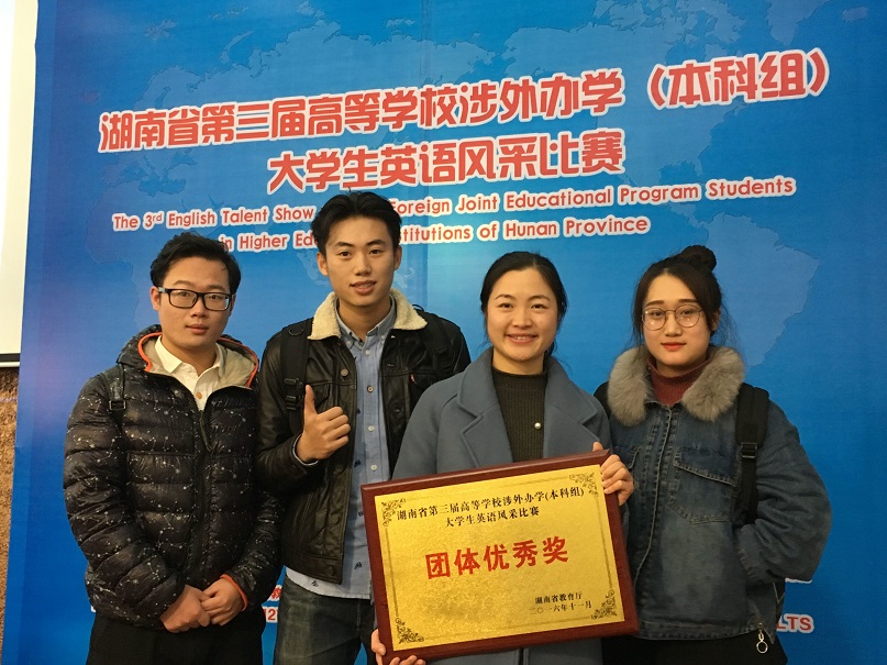 (本网讯)11月26日至27日,湖南省第三届高等学校涉外办学(本科组)大学生英语风采比赛在湖南商学院举行。我校获得团体优秀奖。这也是我校首次参加全省涉外办学本科组英语比赛。