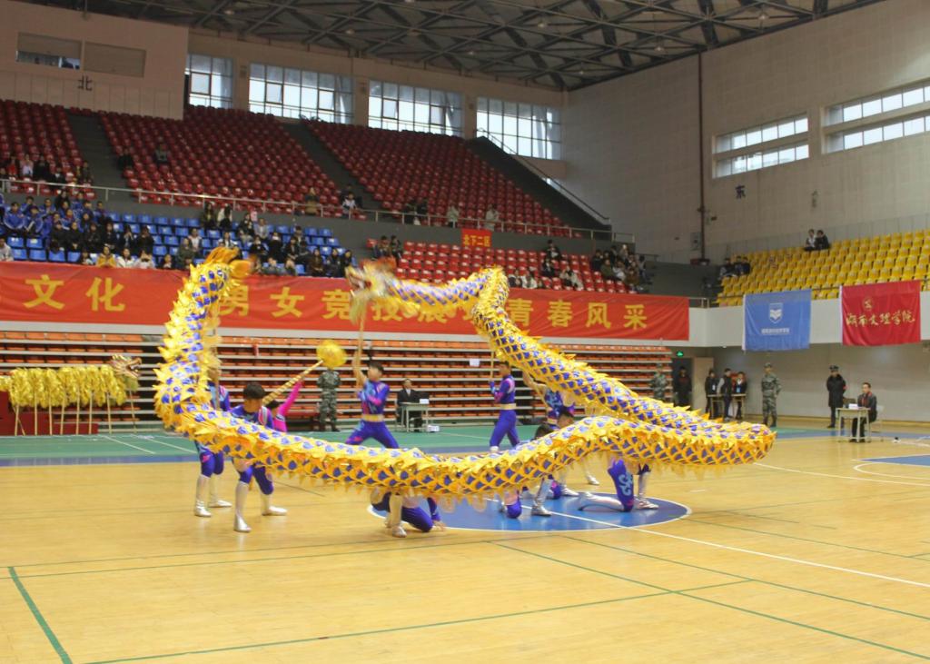 本次比赛由湖南省大学生体育协会主办,湖南网络工程职业学院承办,分为大学男子组、大学女子组、学院男子组、学院女子组、高职专科男子组、高职专科女子组六个组别,设立了规定套路、自选套路、竞速舞龙、障碍舞龙等舞龙类项目和规定北狮、自选北狮、竞速北狮、传统北狮等舞狮类项目,有来自湖南农业大学、湖南网络工程职业学院等11所高校的11支代表队参加了本次比赛。我校代表队在领队熊兴吾,教练员胡科、王高山的带领下参加了学院男子组的比赛,一举获得了规定套路、障碍舞龙两枚金牌。(郭羽)
