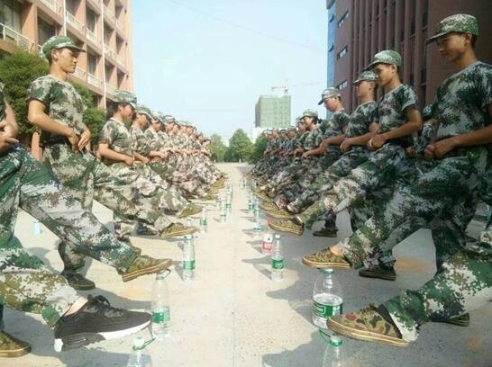 学生教官教新生用矿泉水瓶丈量正步走姿势