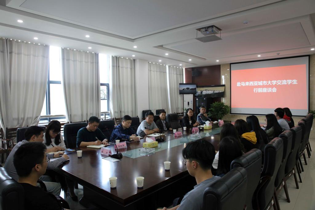 (本网讯)4月2日下午,我校赴马来西亚城市大学交流学生行前座谈会在学校建规楼133会议室举行,学校党委副书记汤放华、副校长刘辉煌,宣传部和保卫处负责人、国际合作与交流处全体人员以及即将赴马来西亚城市大学交流学习的11名学生参加了座谈会。