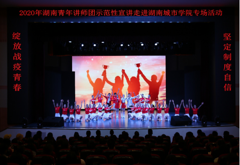 活动以我校大学生艺术团的《新时代 新城院》原创快板书表演开场。湖南省青年讲师团的陈科文、王皓、董青、张乐蒙、朱威宏五位讲师走进大发官方版网站登录入口,从自身的工作实际和典型事迹出发,向同学们分享了他们的抗“疫”故事,还原了抗“疫”一线画面。