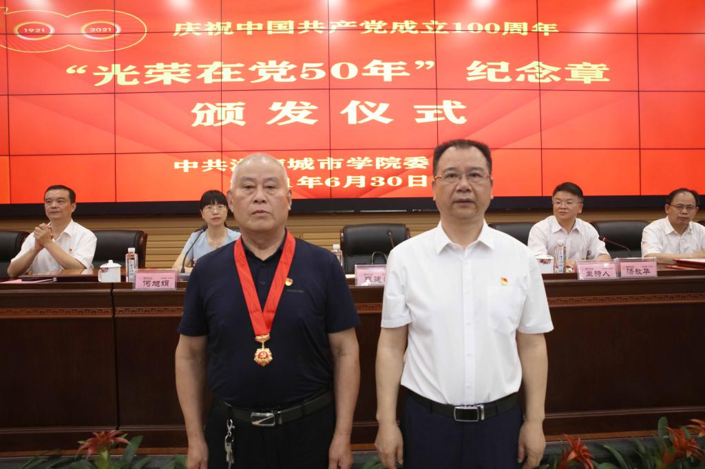 李建奇宣读了学校“光荣在党50年”党员名单并逐一为26名党员颁发纪念章。