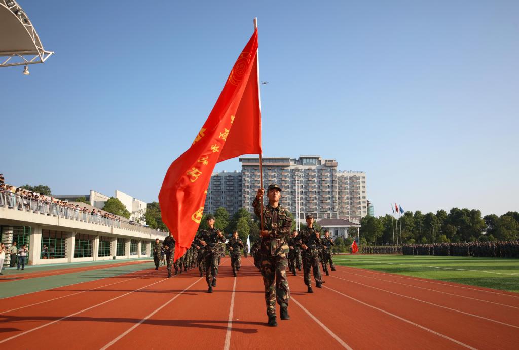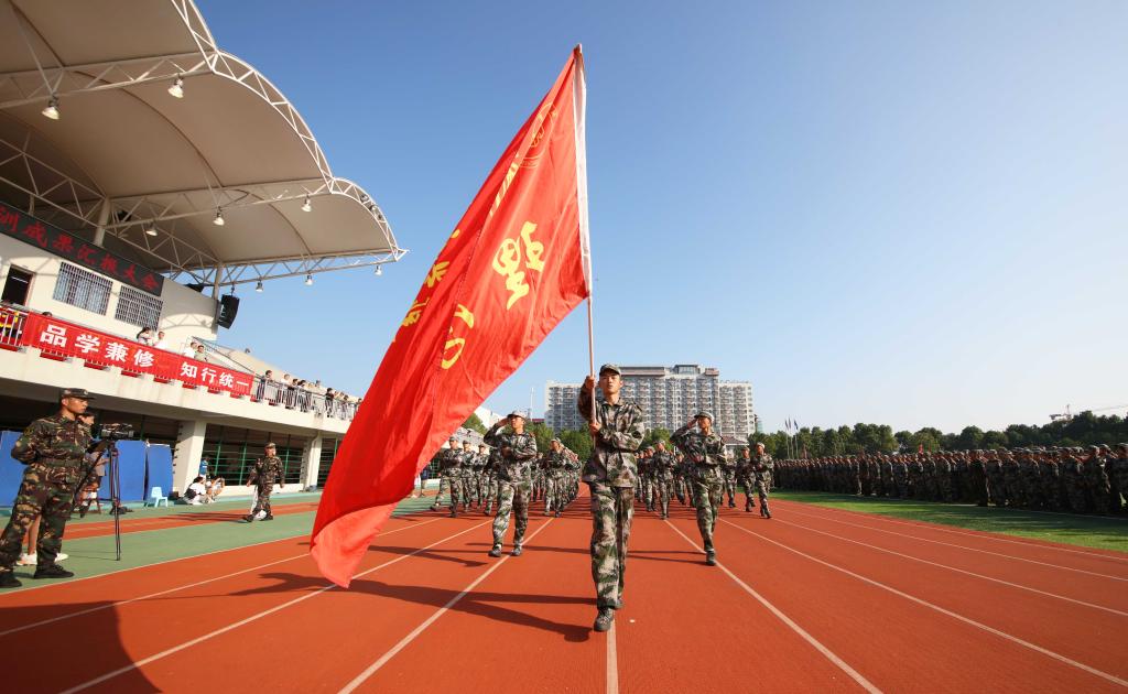 在庄严的国歌声中,五星红旗冉冉升起,全场以饱满的热情齐唱国歌,向国旗行注目礼。汤放华宣布军训成果汇报表演正式开始。