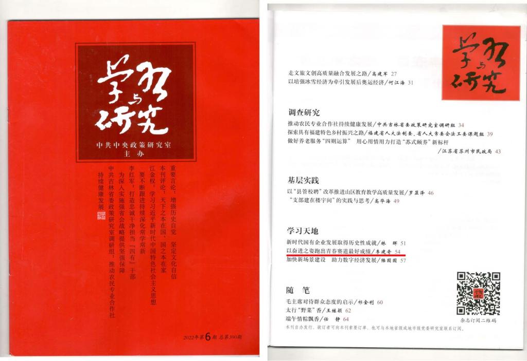 本网讯 中央政策研究室主办《学习与研究》2022年第6期发表我校党委书记李建奇署名文章《以奋进之姿跑出青春赛道最好成绩》,目录在《人民日报》(2022年6月16日第13版)刊登。现全文附后。