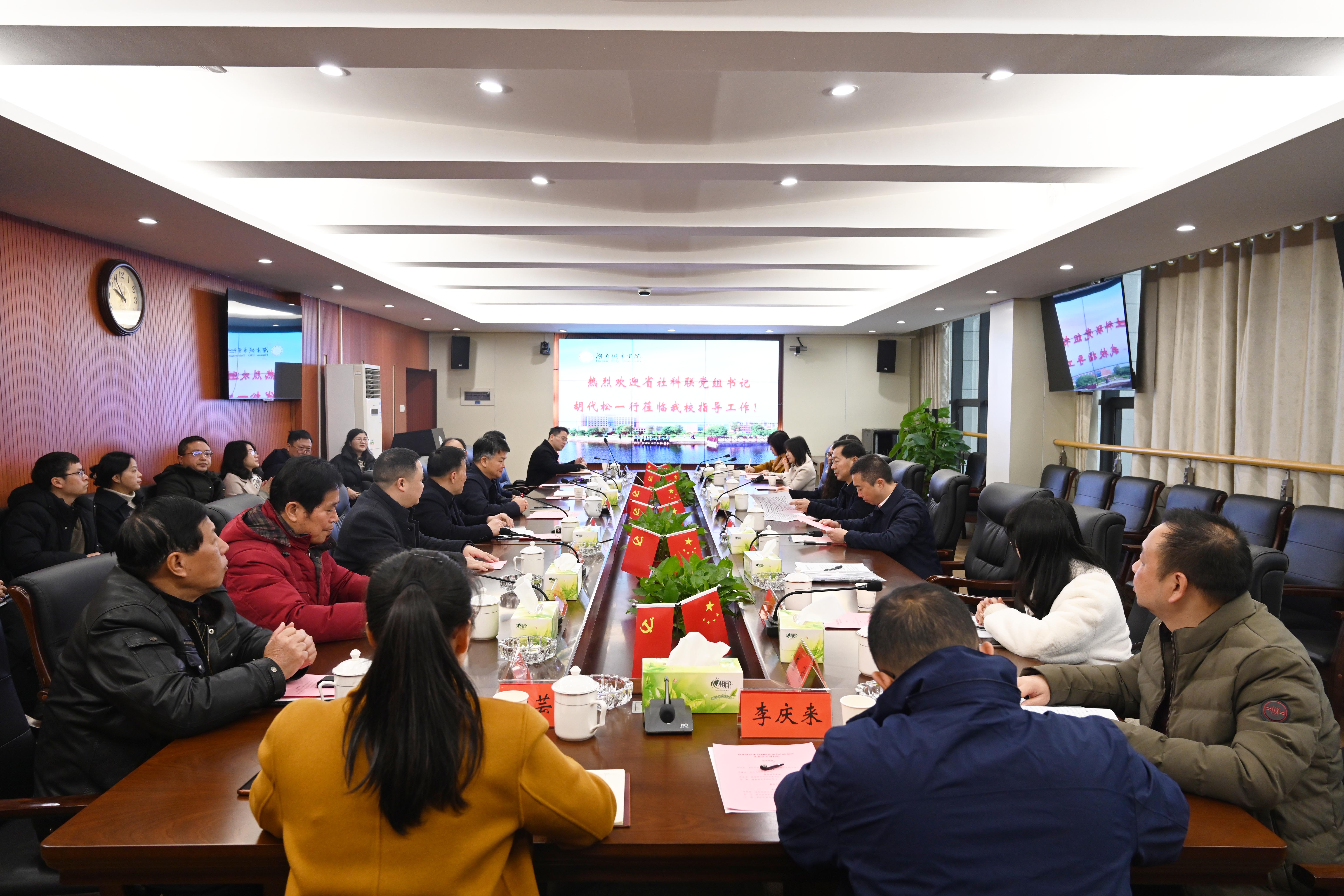 会上,汤放华发表了热情洋溢的致辞,对胡代松一行的到来表示热烈欢迎,对省社科联的关心支持表示感谢,期待我校社科工作在各位领导和专家的关心和支持下,为加快构建中国特色哲学社会科学作出新的更大贡献。何振从我校办学历史、社科成效、特色优势、典型案例和推进计划等方面介绍了我校的办学和社科工作情况。11位益阳市社科界的代表进行了交流发言。