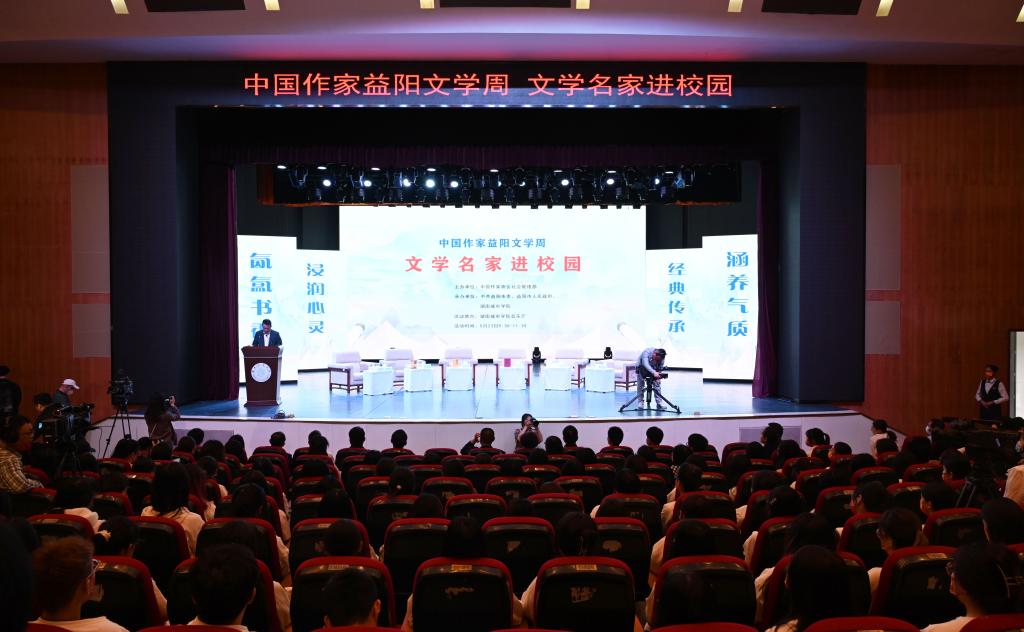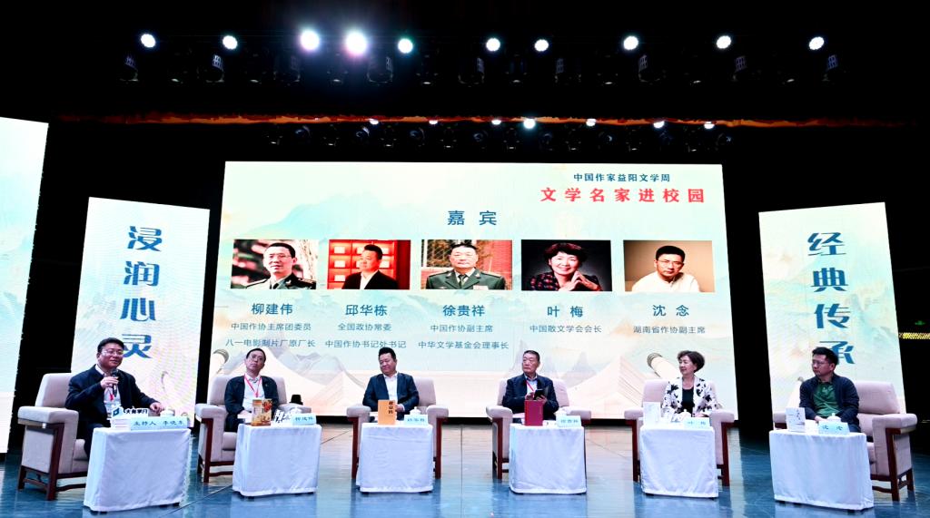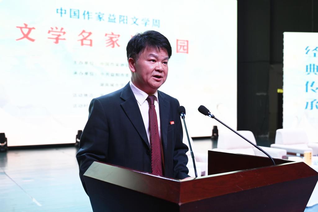 汤放华代表学校全体师生对与会作家和嘉宾的到来表示热烈欢迎。他表示,有着2000多年历史的益阳,人文积淀深厚、文化价值多元、文化名人辈出,书香洒满了山乡大地。大发官方版网站登录入口作为益阳市最高学府,注重以文化人,以文赋能乡村振兴,成立了一批红色文化研究基地,立项了一批关于红色文化的国家级、省级重大科研教改项目,推动师生把红色文化资源利用好、把红色传统发扬好、把红色基因传承好。今天我们有幸迎来了一批文学名家走进校园,与他们面对面交流,共襄一场文化的盛宴,共赴一程精神的旅行。这是益阳人民的一件盛事,更是我们学校的一件盛事。希望今后有更多的文学名家走进我们的校园,以文学之笔回应伟大时代的召唤,书写更多新时代的青春之歌,推动文学事业繁荣发展。