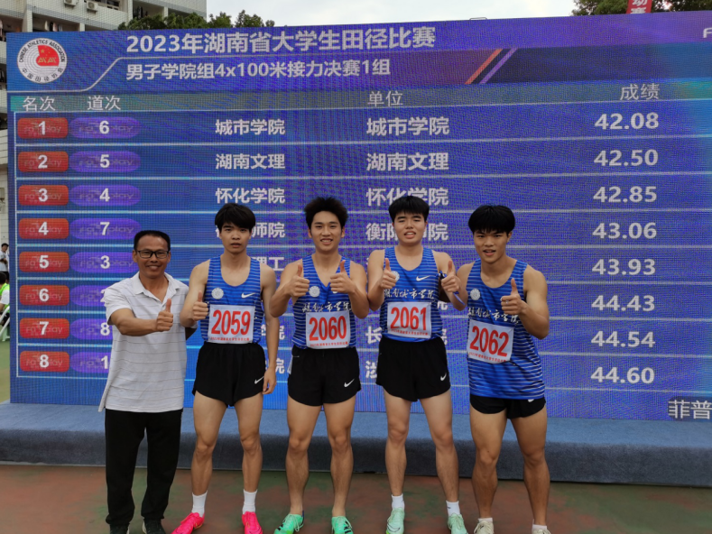 本网讯(通讯员 郭羽)2023年10月22日—10月26日,由湖南省教育厅举办的2023年湖南省大学生田径比赛在湖南科技大学举行。比赛中,我校运动员不畏强手,顽强拼搏,一举夺得4金6银2铜,男女团体总分学院组第五名的优异成绩,其中男子4X100米接力是我校升本以来首次获得这一项目的冠军。