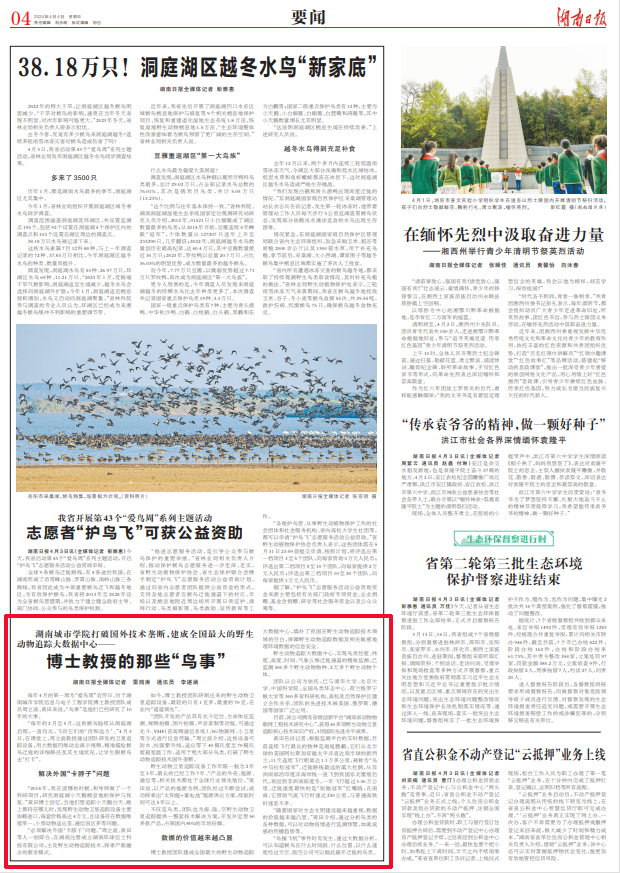 本网讯 4月4日,《湖南日报》第4版(要闻版)报道大发官方版网站登录入口博士教授团十年来专注于野生动物卫星追踪技术研发,打破了国外技术垄断,建成了全国最大的野生动物追踪大数据中心。全文如下: