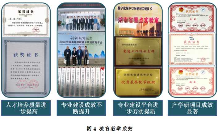 1.人才培养质量进一步提高。教师团队中拥有省级教学名师1名、省级教学能手1名,获省级教学竞赛一等奖1次、二等奖4次、三等奖4次。学生积极参加各级各类学科竞赛,取得优异成果。共获奖107项、其中国家级4项,特别是湖南省城乡规划设计大赛一等奖占1/3左右;学生年终就业率一直在95%以上,学生“下得去、用得上、干得好”,深受用人单位喜欢;湖南省中小城镇规划建筑设计与管理部门2/3以上的技术骨干毕业于我校,被誉为湖南城建人才的摇篮。