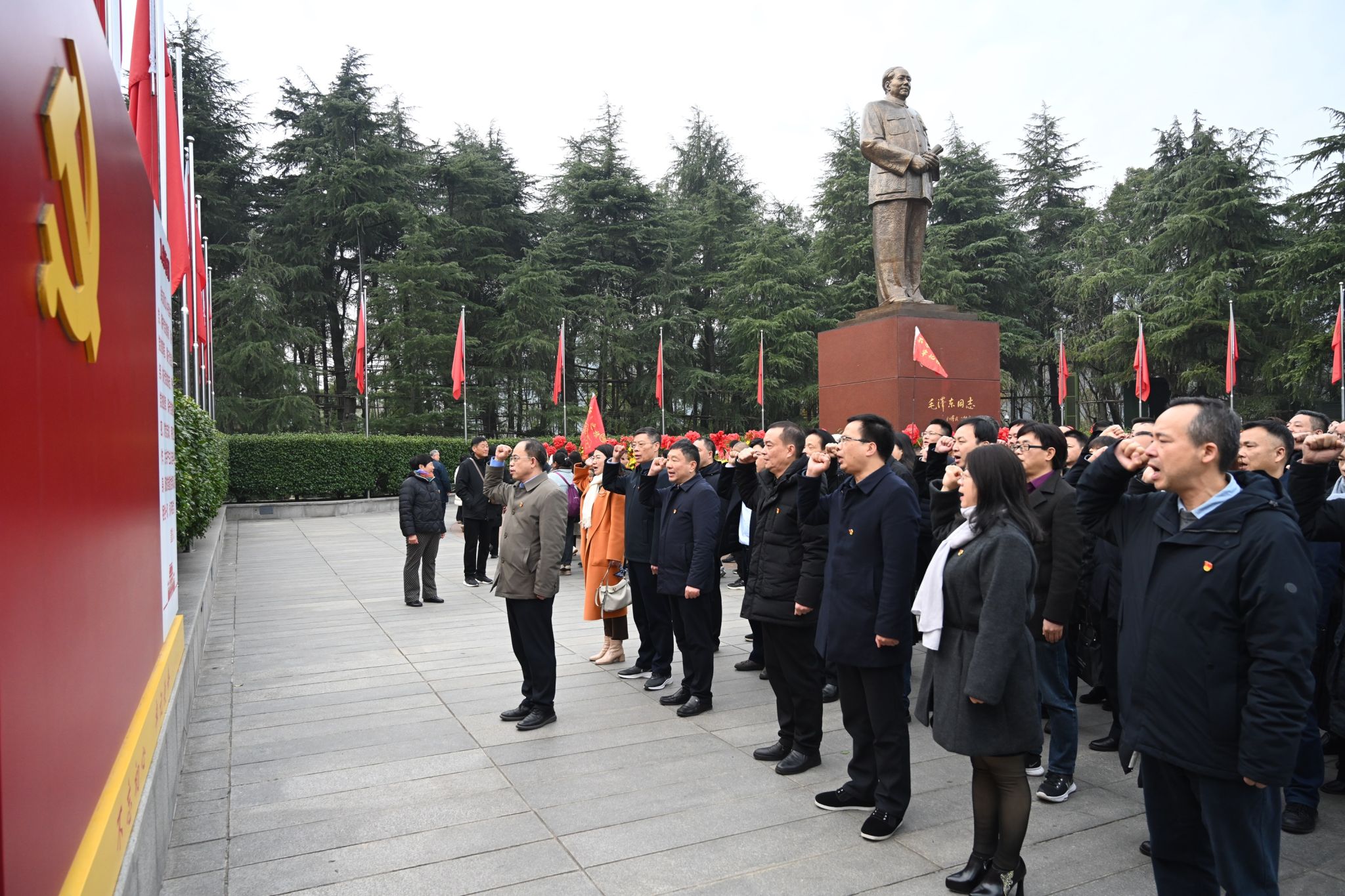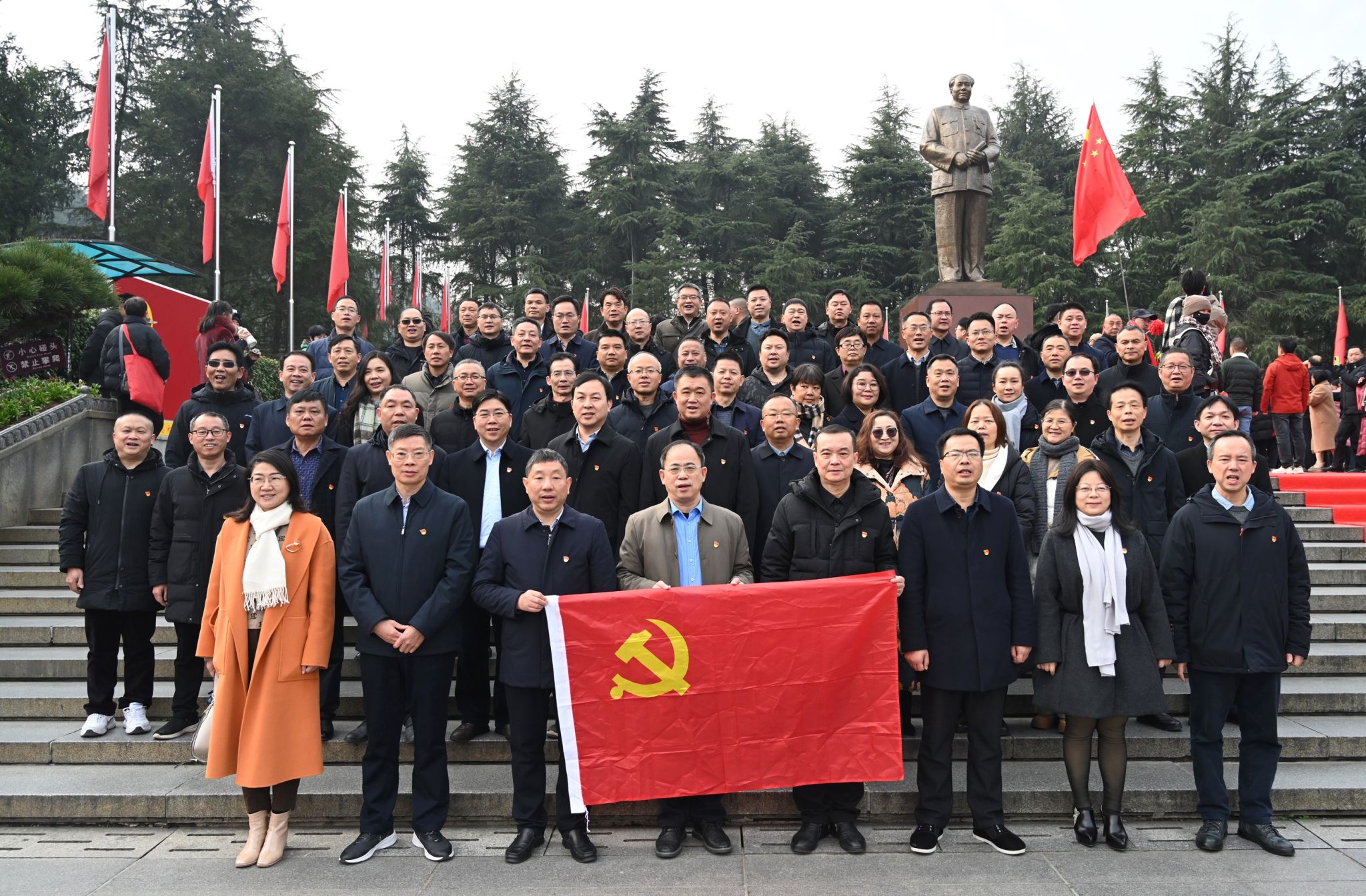 25日上午9:30,在韶山毛泽东广场,红旗招展,歌声嘹亮,人民群众热情歌颂一代伟人。校长何振率全体成员向毛泽东铜像敬献花篮,寄托对毛主席的无限敬仰之情。何振缓步上前,仔细整理花篮上的红色缎带,全体在场人员向伟人铜像鞠躬致敬。在何振的带领下,大家紧握右拳,面向鲜红党旗,重温入党誓词,追寻初心,汲取力量。