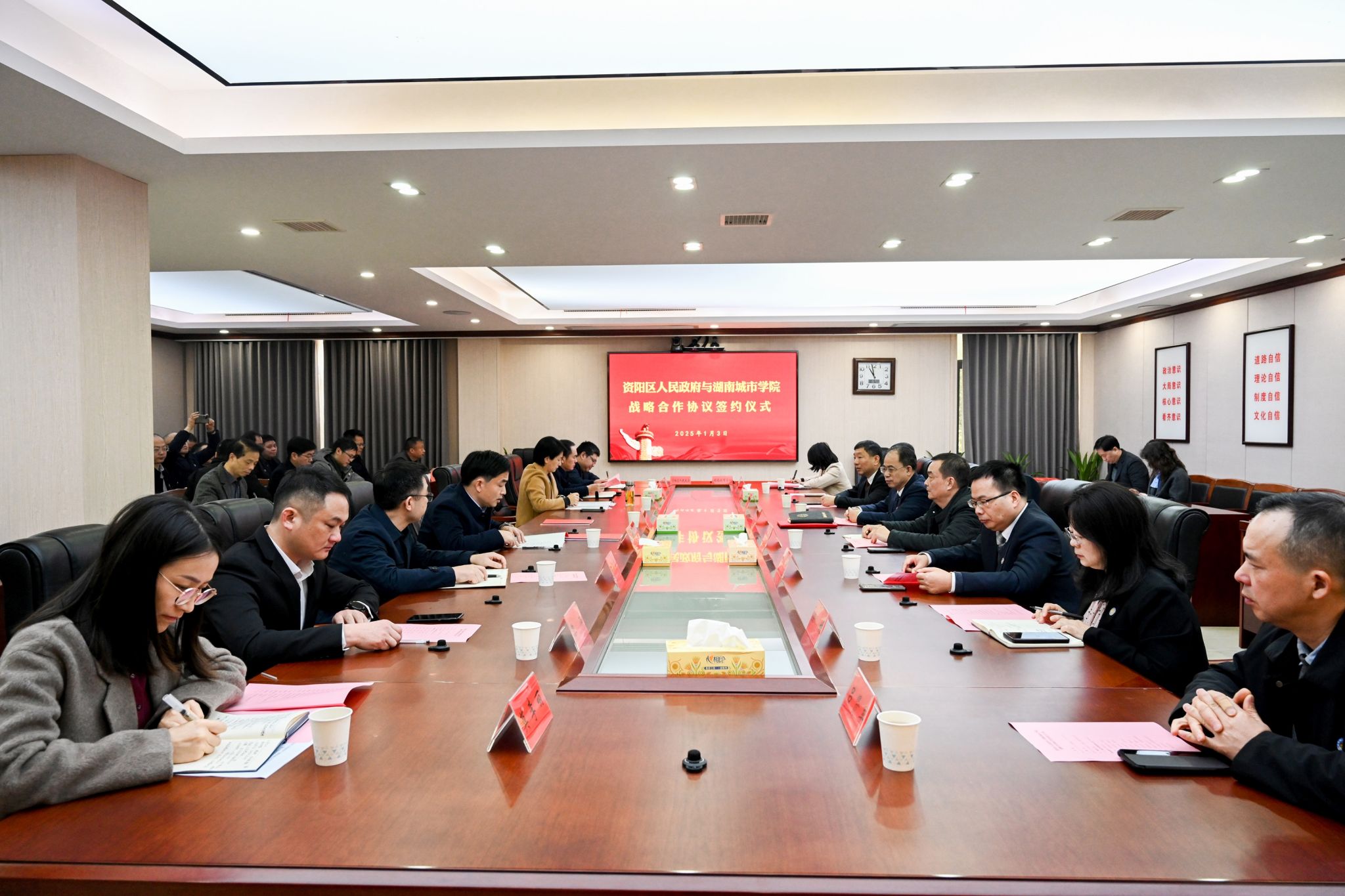 本网讯 1月3日,我校与资阳区人民政府战略合作协议签约仪式举行。全体校领导出席签约仪式,资阳区区长黄瑛致欢迎辞,资阳区区委副书记、区委统战部部长张辉主持会议。
