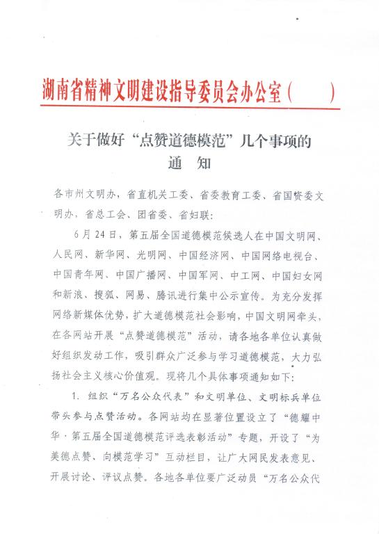 为充分发挥网络新媒体优势,扩大道德模范社会影响,第五届全国道德模范候选人在中国文明网(http://www.wenming.cn/)等相关网站进行集中公示宣传,并开展“点赞道德模范”活动。现将省文明办《关于做好“点赞道德模范”几个事项的通知》转发给你们,请认真贯彻执行。