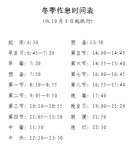 附:1.冬季作息时间表