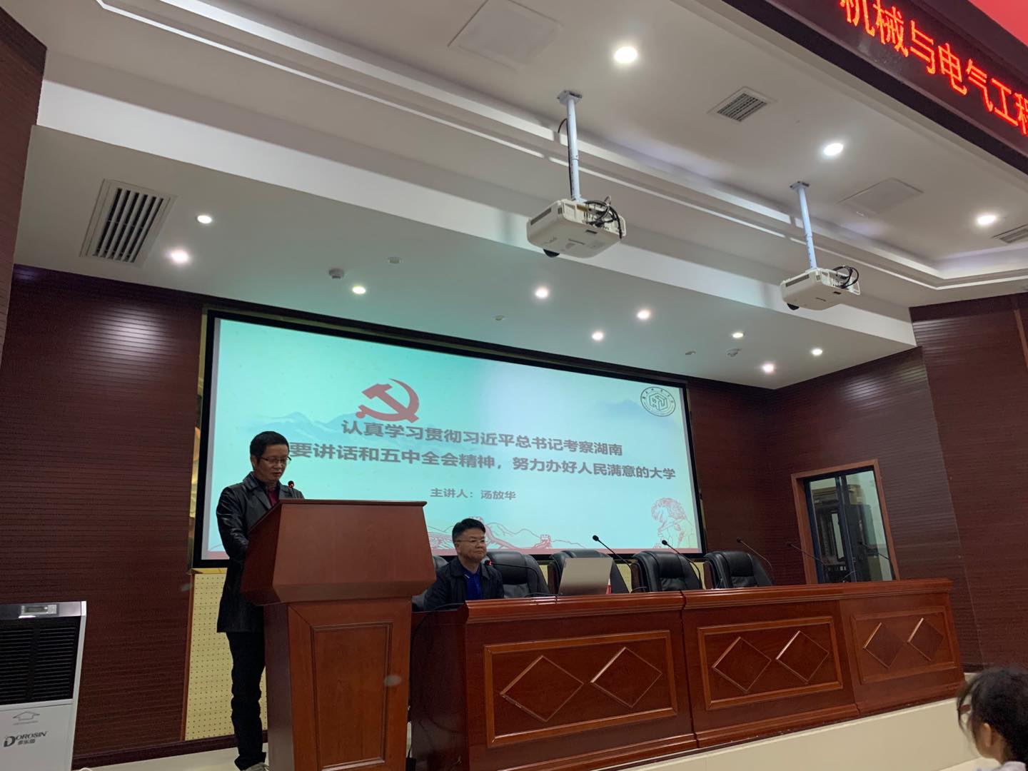 115下午机械与电气工程学院和理学院/教师教育学院在建规楼121报告厅举行教职工政治学习,专题学习习近平总书记考察湖南重要讲话和十九届五中全会精神学校党委副书记汤放华做了题为《认真学习贯彻习近平总书记考察湖南重要讲话和五中全会精神,努力办好人民满意的大学》的宣讲报告,两个学院的全体教职工参加了此次政治学习。