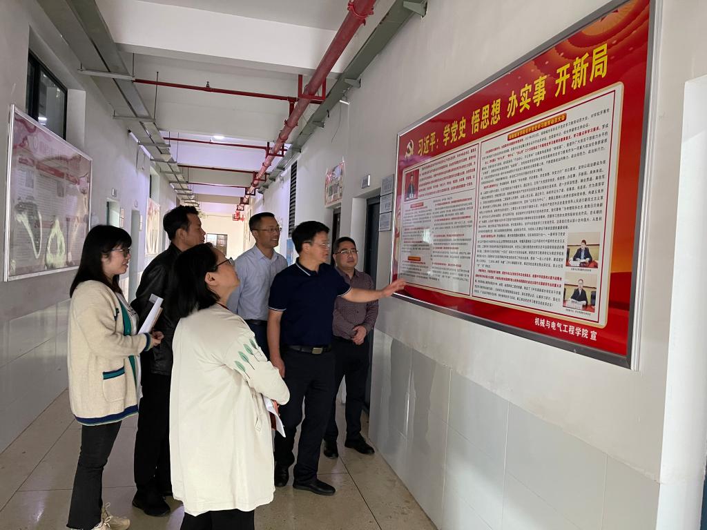 校长汤放华深入机械与电气工程学院检查指导党史学习教育开展情况,党校党委宣传部副部长饶迎等陪同检查。