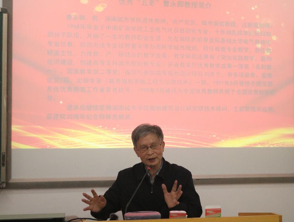 曹永卿,城市规划教授,注册规划师。1991年5月被授予建设部系统优秀教育工作者荣誉称号;1998年9月被评为全国优秀教师并授予全国优秀教师称号。退休后继续受骋大发官方版网站登录入口规划建筑设计研究院技术顾问,主助新技术应用,获建院30周年纪念特殊贡献奖。曹永卿教授以“不忘初心,砥砺前行-我的教书育人”为题分享了个人成长奋斗的经历,勉励青年学生脚踏实地,努力奋斗,实现人生价值。