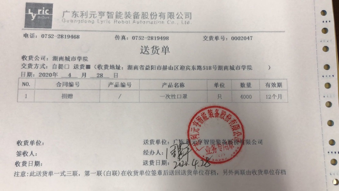 428日上午,广东利元亨智能装备股份有限公司(以下称利元亨)作为我校校企合作单位,向我校机械与电气工程学院捐赠4000只口罩,用于新冠肺炎疫情防治工作,助力复工复学。机械与电气工程学院院长阳同光、副院长周理代表学院签收了本次物资。
