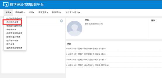 1、用教师身份登录城院门户,点击页面左侧“新教务系统。点击申请→场地预约申请。