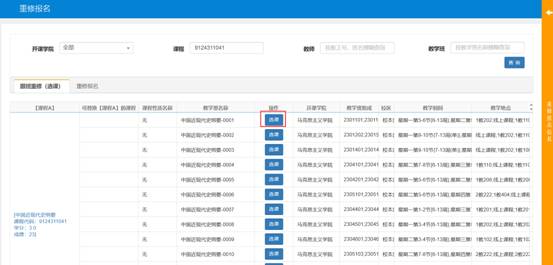 进入重修报名页面,如“跟班重修(选课)”界面中有教学班显示,请先在“跟班重修(选课)”中选择相应的教学班,点击选课,根据提示操作。