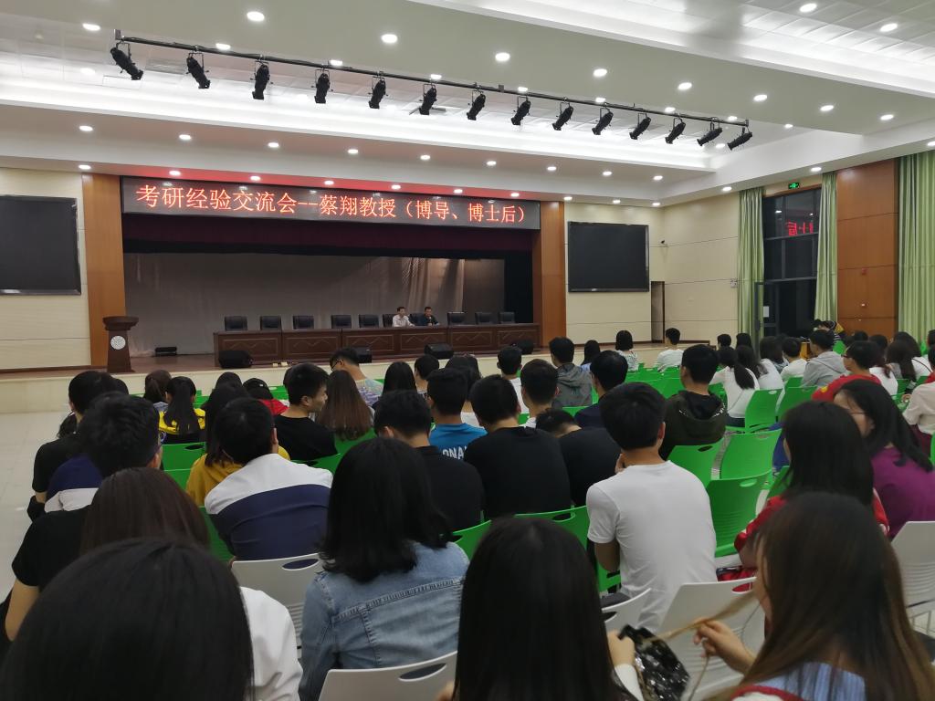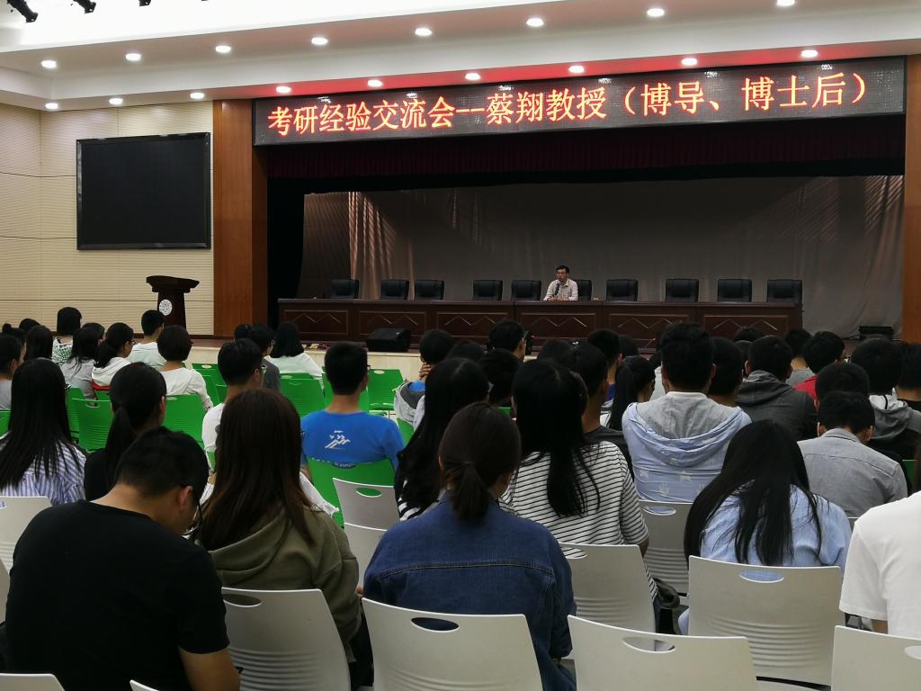 2018年4月18日晚7:00,管理学院就业与考研经验交流会于新食堂三楼学生活动中心举行,本次交流会由桂林电子科技大学博士生导师蔡翔教授进行主讲,大发官方版网站登录入口管理学院党委副书记贺望林主持,出席本次交流会的有管理学院学工办主任王方俊、辅导员张力、14级考研录取学生代表以及15、16级有考研意向的学生。