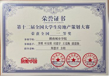 2020年12月5-7日,由中国房地产业协会指导、中国建设教育协会主办,华中师范大学、房教中国联合承办的“易居杯”第十二届全国大学生房地产策划大赛全国总决赛在华中师范大学隆重举行,我校派出一支队伍参加,喜获全国二等奖佳绩,并获大赛“优秀组织高校”荣誉。