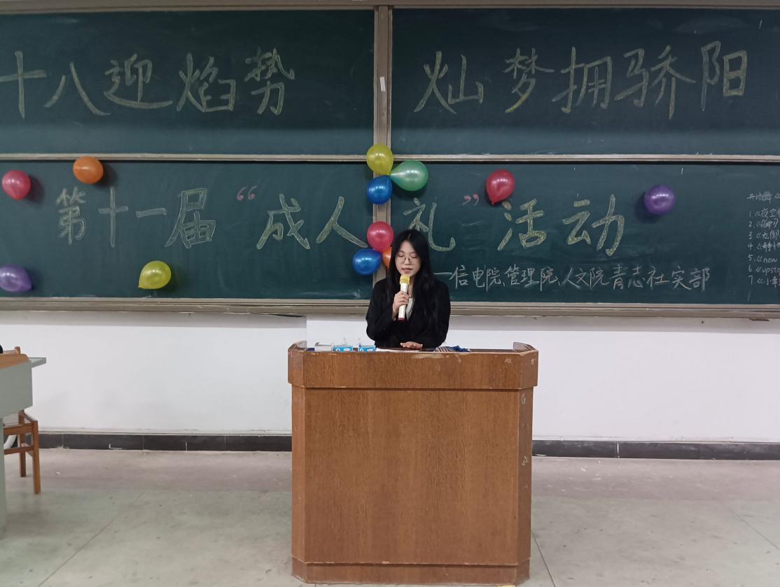 十八迎焰势,灿梦拥骄阳。为了让学生们充分认识到跨入十八岁成人行列的意义,管理学院联合人文学院和信息与电子工程学院于11月12日上午8时30分在一教207举办第十一届成人礼活动。