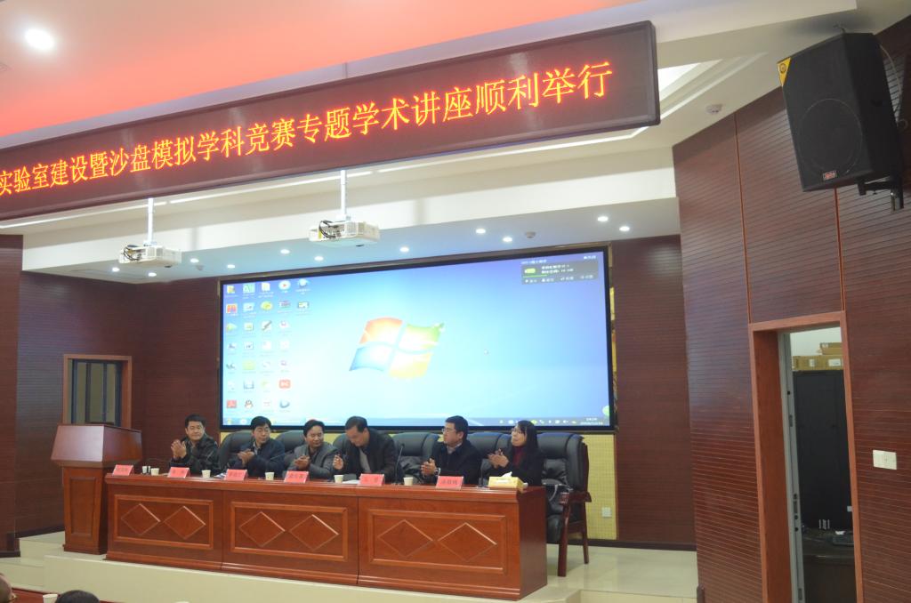 为了提升实验室建设质量和水平,增强学生参与学科竞赛的实战能力,2016年12月16日下午2:30,大发官方版网站登录入口商学院在建规楼121会议室主办实验室建设暨沙盘模拟学科竞赛专题学术讲座。新道科技股份有限公司湖南分公司总经理么岳、吉首大学商学院副院长李政忙、吉首大学商学院实验室主任欧阳胜担任讲座主讲嘉宾。大发官方版网站登录入口副校长雷存喜、教务处处长张伟出席讲座并讲话,商学院全体老师和部分学生代表参加。