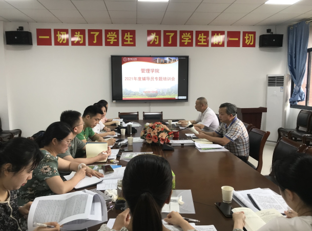 为深入学习贯彻习近平新时代中国特色社会主义思想,落实高校立德树人根本任务,贯彻全国教育大会、高校思想政治工作会议精神,遵照教育部《普通高等学校辅导员队伍建设规定》,为切实提升学院辅导员的履职能力、专业素养和工作水平,7月8日全天,管理学院组织全体辅导员进行了专题培训,培训会由党委副书记王润华主持,学院党委书记王正安全程参加并作重要指导。
