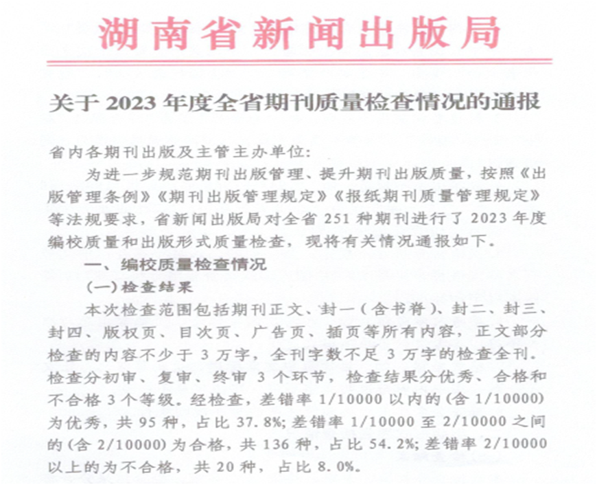 期刊质量检查现已纳入全省意识形态巡视考核内容,是期刊社会效益评价考核和期刊年度核验的重要内容,主要检查各刊编校质量和出版形式质量,检查结果分为优秀、合格和不合格3个等级。本次检查了全省251种期刊,其中,差错率在1/10000以内(含1/10000)的期刊为优秀,《大发官方版网站登录入口学报(自然科学版)》和《城市学刊》在全省高校学报中表现优异。