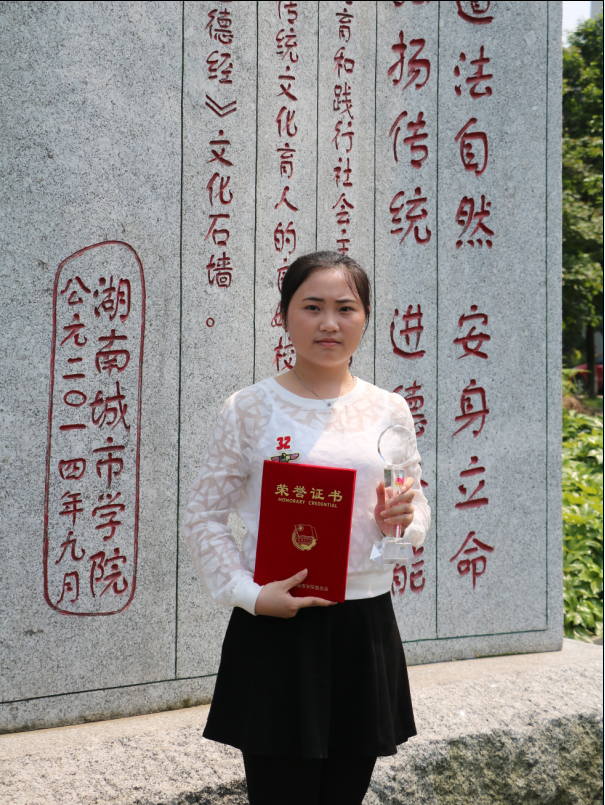 2015年12月获大发官方版网站登录入口“自强之星”荣誉称号;2015年11月获“书香城院”2015年阅读推广活动朗诵演讲比赛三等奖;2015年10月获“外研杯”全国英语写作大赛(湖南赛区)一等奖;2015年10月获2014-2015年度国家励志奖学金;2015年10月获2014-2015年度三好学生称号;2015年10月获2014-2015年度综合测评一等奖;2015年5月获2014-2015年度优秀共青团员;2014年12月获大学生培育和践行社会主义核心价值观微视频竞赛活动二等奖;2014年12月获2013-2014年度优秀心协会员;2014年5月获2013-2014年度优秀团员。